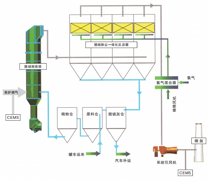 煙氣在系統(tǒng)風(fēng)機(jī)的作用下先進(jìn)入純干法脫硫系統(tǒng),后通過除塵脫硝系統(tǒng),最后由風(fēng)機(jī)回送至原焦?fàn)t煙囪達(dá)標(biāo)排放。